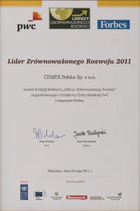 W konkursie “Liderzy Zrównoważonego Rozwoju” organizowanym przez magazyn Forbes CEMEX Polska otrzymał jedną z trzech głównych nagród za całokształt działalności w zakresie zrównoważonego rozwoju ze szczególnym uwzględnieniem inicjatyw w zakresie obniżenia emisji CO2 i stosowania paliw alternatywnych.