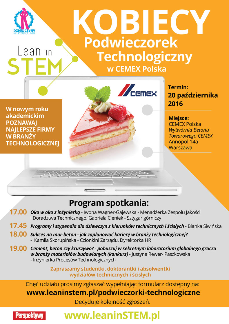 Już 20 października zapraszamy studentki i doktorantki wydziałów technicznych i ścisłych na Kobiecy Podwieczorek Technologiczny w siedzibie CEMEX Polska do Wytwórni Betonu Towarowego w Warszawie. Będzie to okazja do poznania inżynierek pracujących w CEMEX, a także odwiedzenia laboratorium. Każda uczestniczka otrzyma też betonowy gadżet.