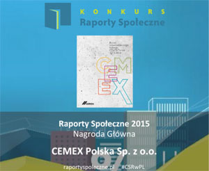 Raport zrównoważonego rozwoju CEMEX Polska 2013-2014 został wybrany spośród blisko czterdziestu raportów zgłoszonych do IX edycji konkursu Raporty Społeczne. Jury, w skład którego wchodzą przedstawiciele organizacji pozarządowych, biznesu, ministerstw, uczelni, stowarzyszeń pracodawców, eksperci z dziedziny ekonomii, ochrony środowiska i społecznej odpowiedzialności oceniało kompletność zgłoszonych raportów, ich wiarygodność i komunikację interesariuszom.  Organizatorami konkursu są Forum Odpowiedzialnego Biznesu, Deloitte oraz SGS. Patronat nad wydarzeniem objęło Ministerstwo Gospodarki oraz Ministerstwo Finansów.