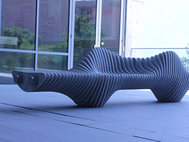 Para concebir su banca, el equipo tuvo la idea de crear 30 piezas molde, con distintas proporciones, que se repiten como en un espejo hasta crear una forma completa apoyada sobre dos ejes.