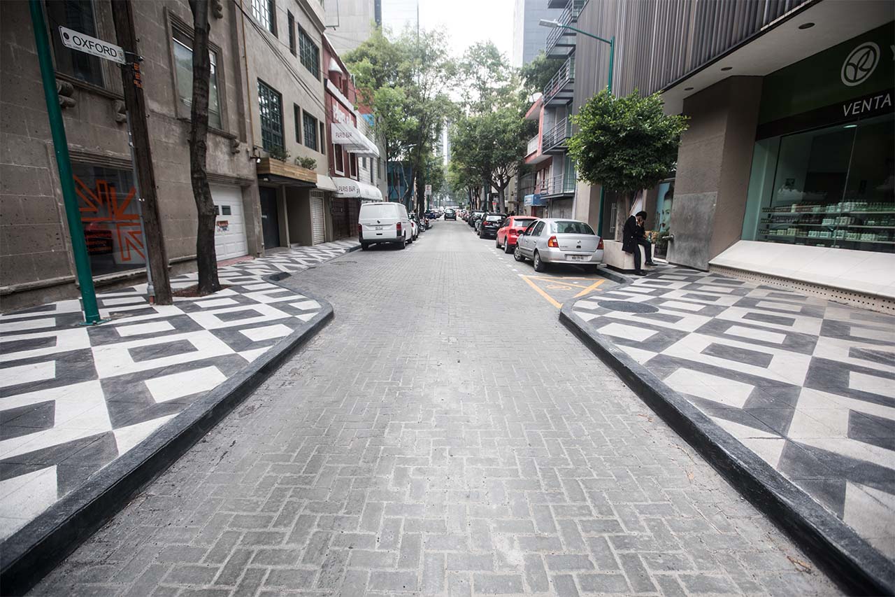 Para darle un nuevo aire a la Zona Rosa, CEMEX desarrolló pavimentos arquitectónicos de concreto con color integral y un diseño especial para sus banquetas, las cuales además cuentan con un acabado martelinado que brinda más seguridad a los peatones por su característica antiderrapante.