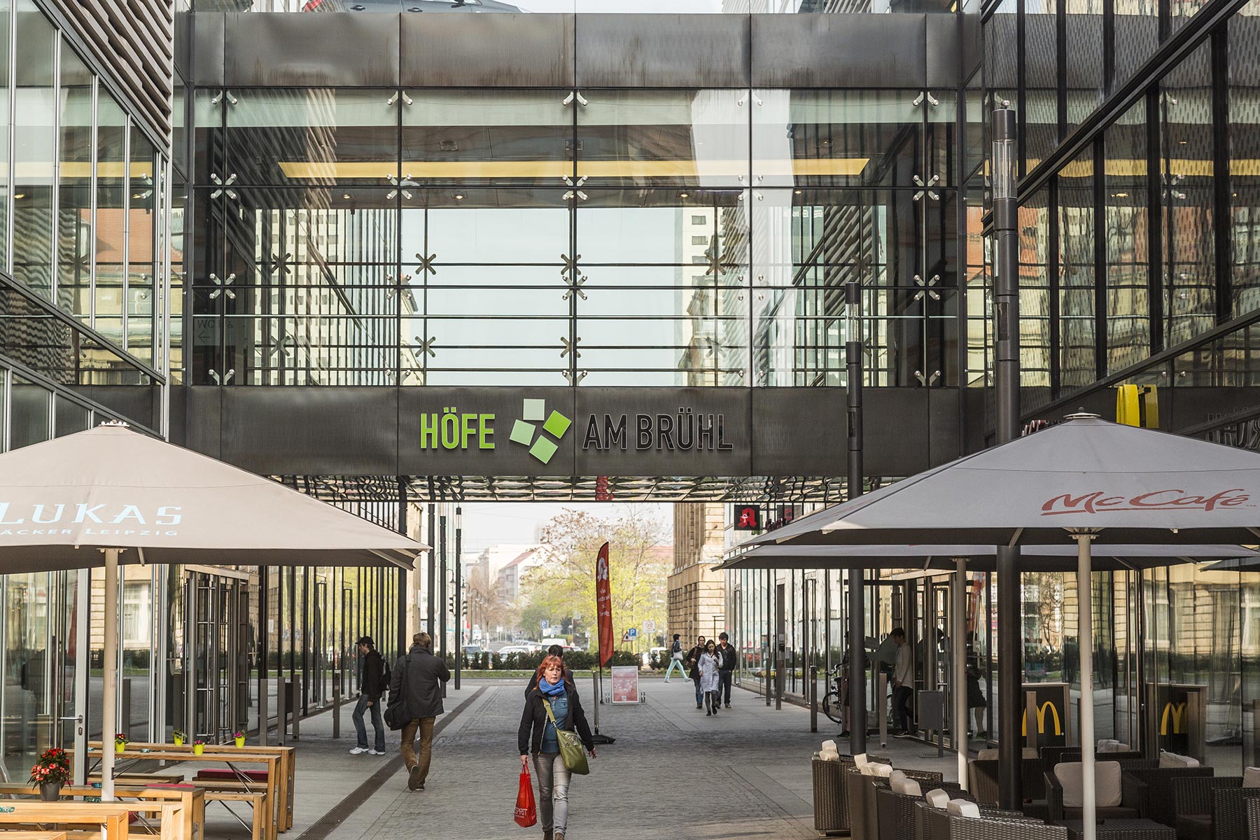 Höfe am Brühl es un centro comercial de tres niveles en pleno corazón de Leipzig que cuenta con 130 tiendas y varios restaurantes con 820 lugares de estacionamiento. El Höfe, o “patio”, fue construido en la histórica Calle Brühl donde nació el famoso compositor W. Richard Wagner.