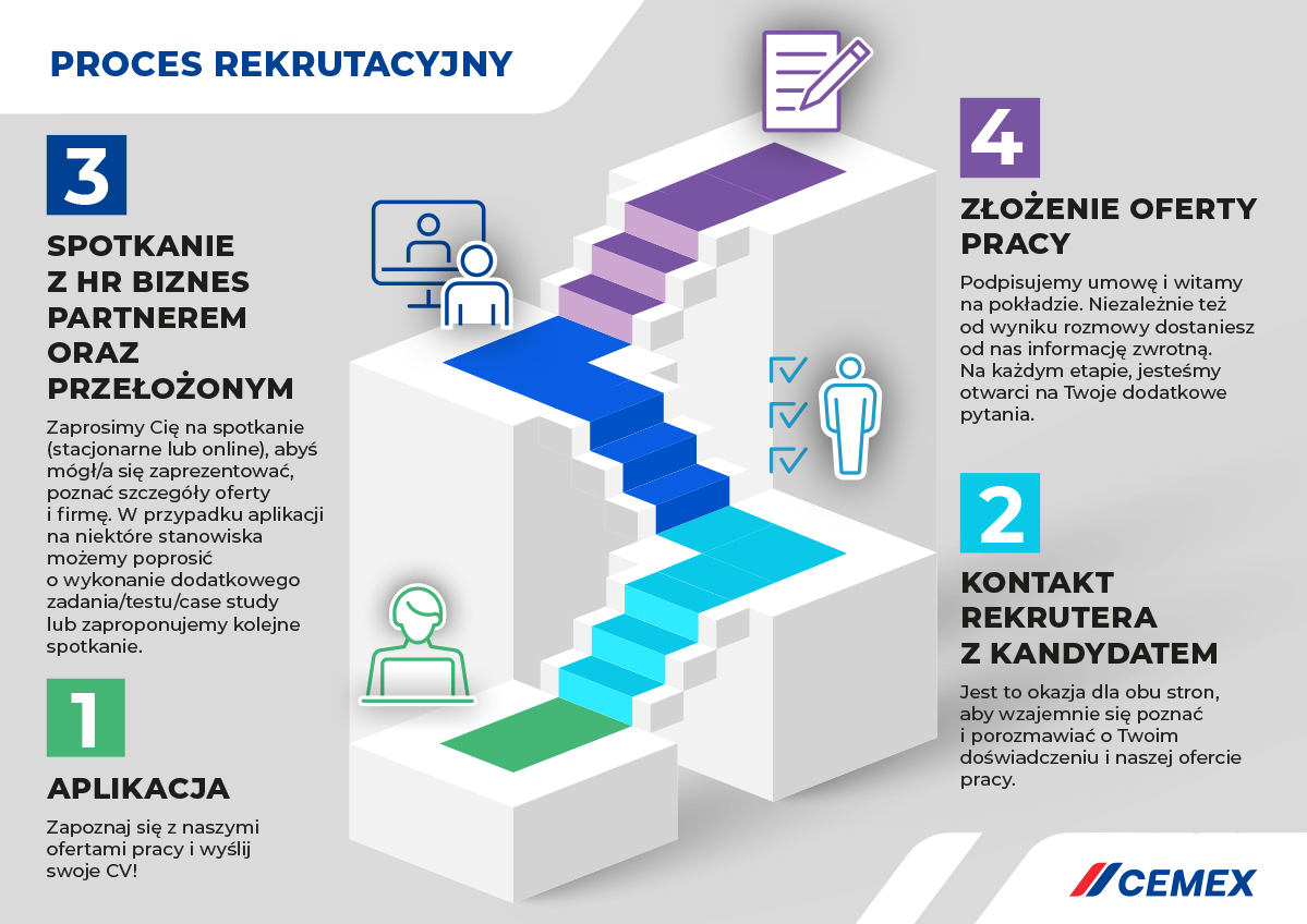 Osoby, które posiadają umiejętności i ambicje rozwoju kariery – mogą liczyć na wsparcie - również poprzez praktyczne sprawdzanie się w nowych zadaniach i wyzwaniach zawodowych. W awansach stawiamy na promowanie najlepszych i odpowiedzialnych pracowników, którzy działają zgodnie z wartościami CEMEX. Sukces biznesowy naszej firmy oparty jest na LUDZIACH.