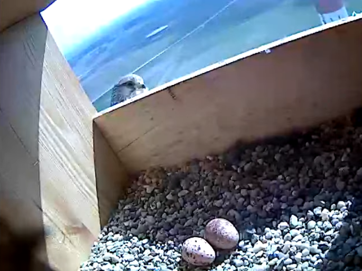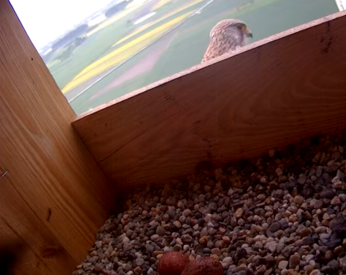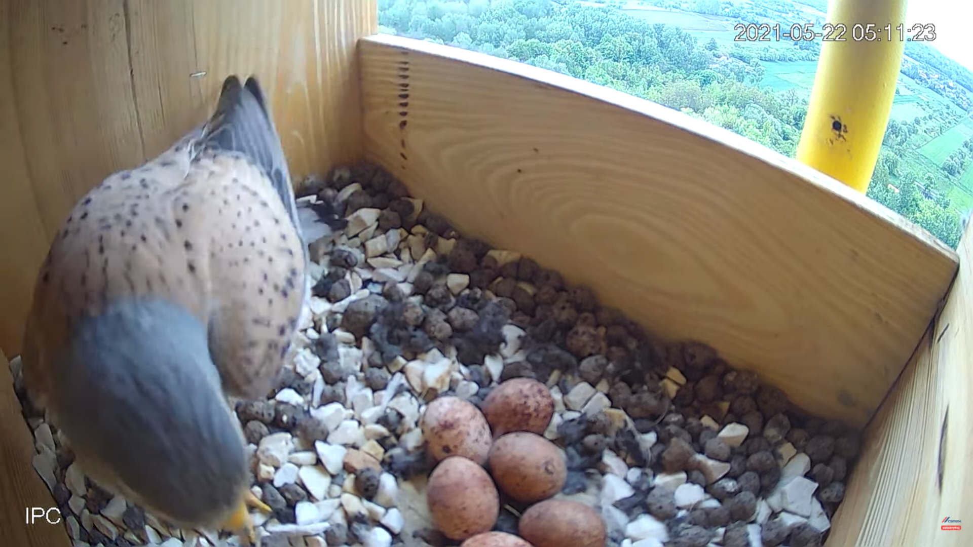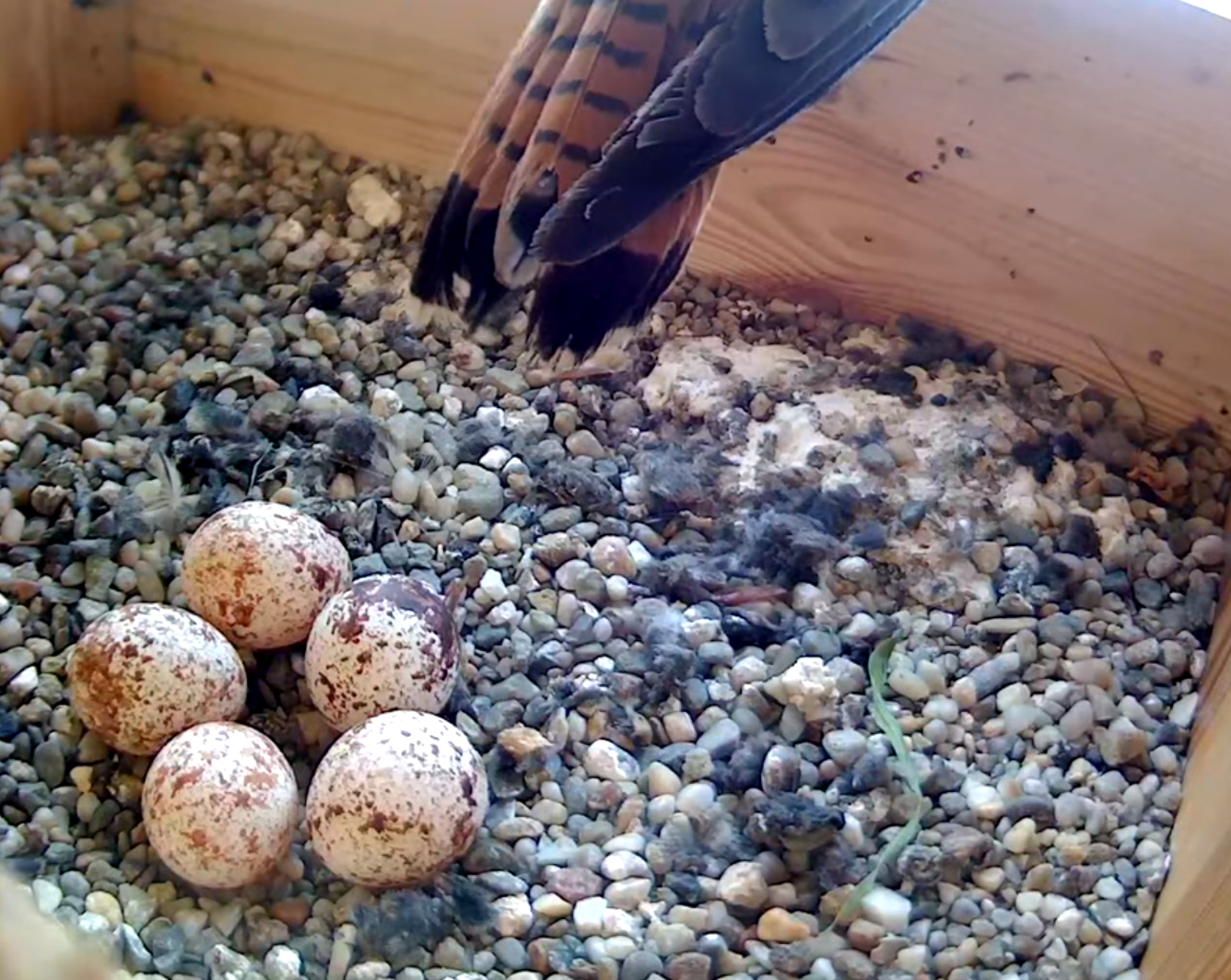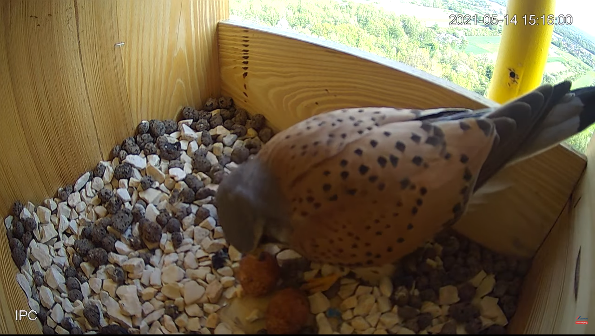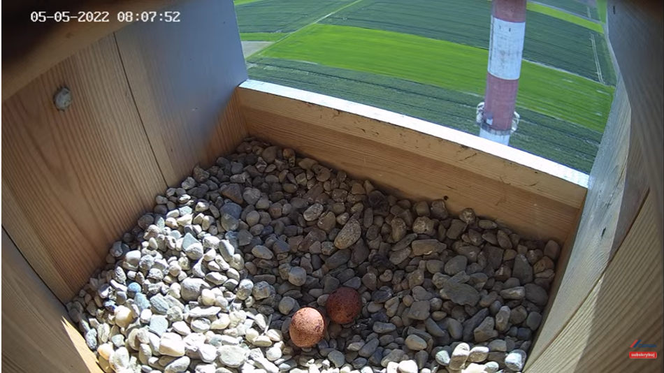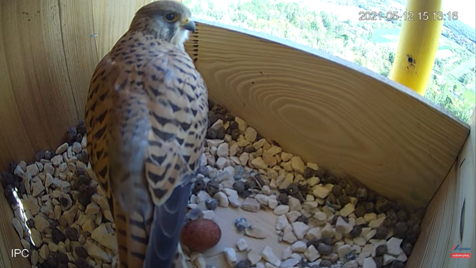 Drugie jajo u Rodziny Kruszywowskich w Cementowni Rudniki Co ciekawe pustułki nie tylko nie budują własnych gniazd, ale też nie przynoszą do budek lęgowych materiału do ich wyścielenia. Jaja składają bezpośrednio na żwirku wypełniającym budkę. |