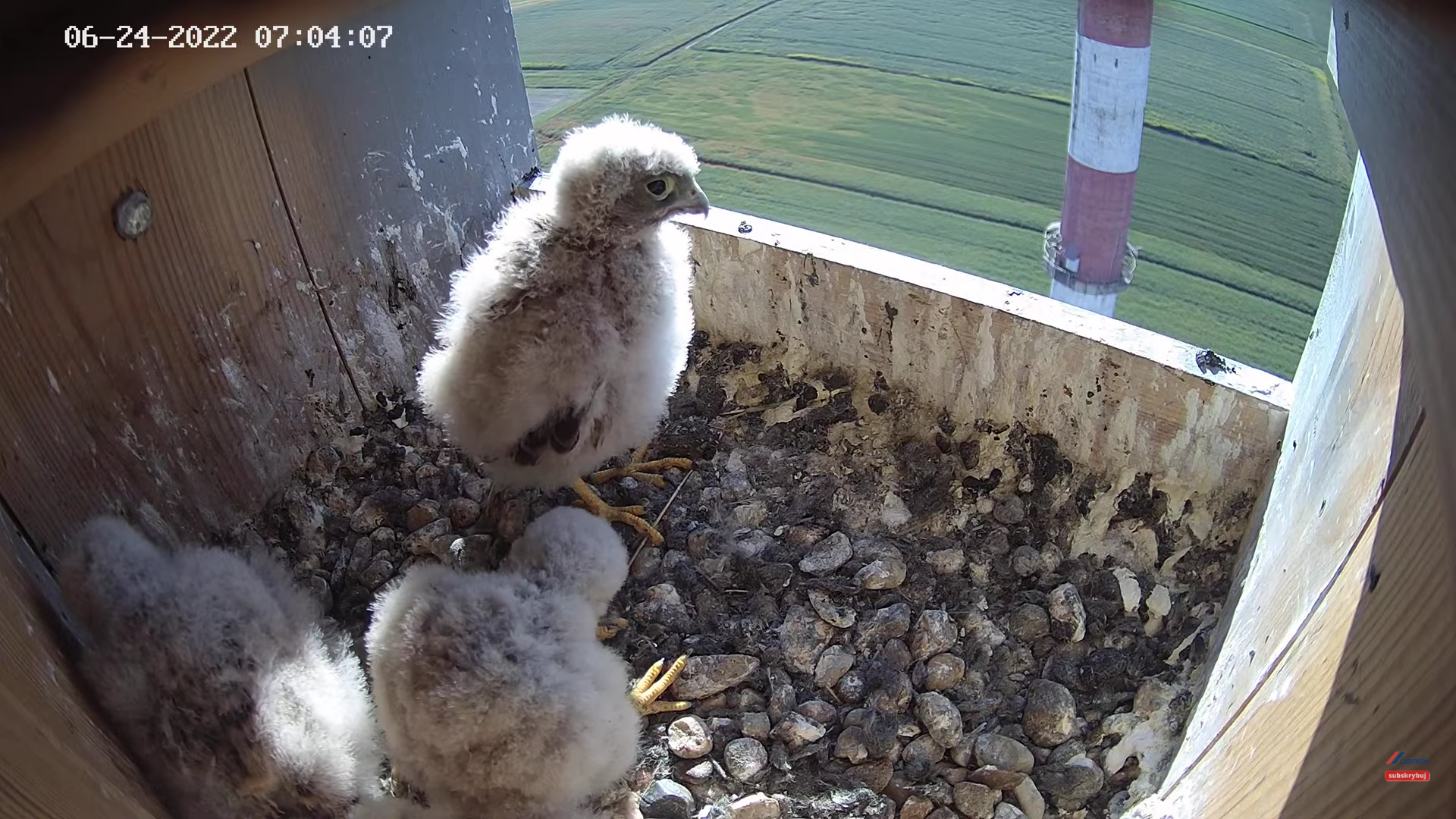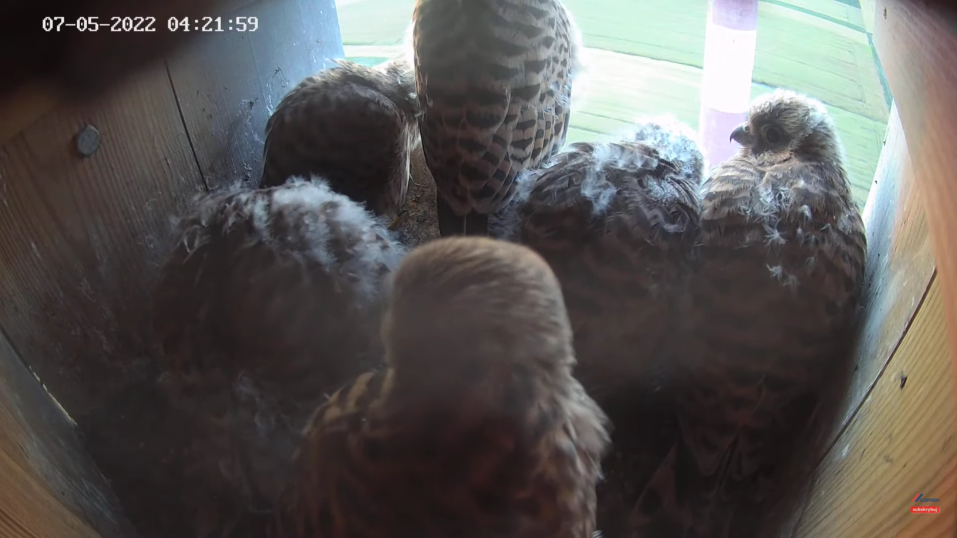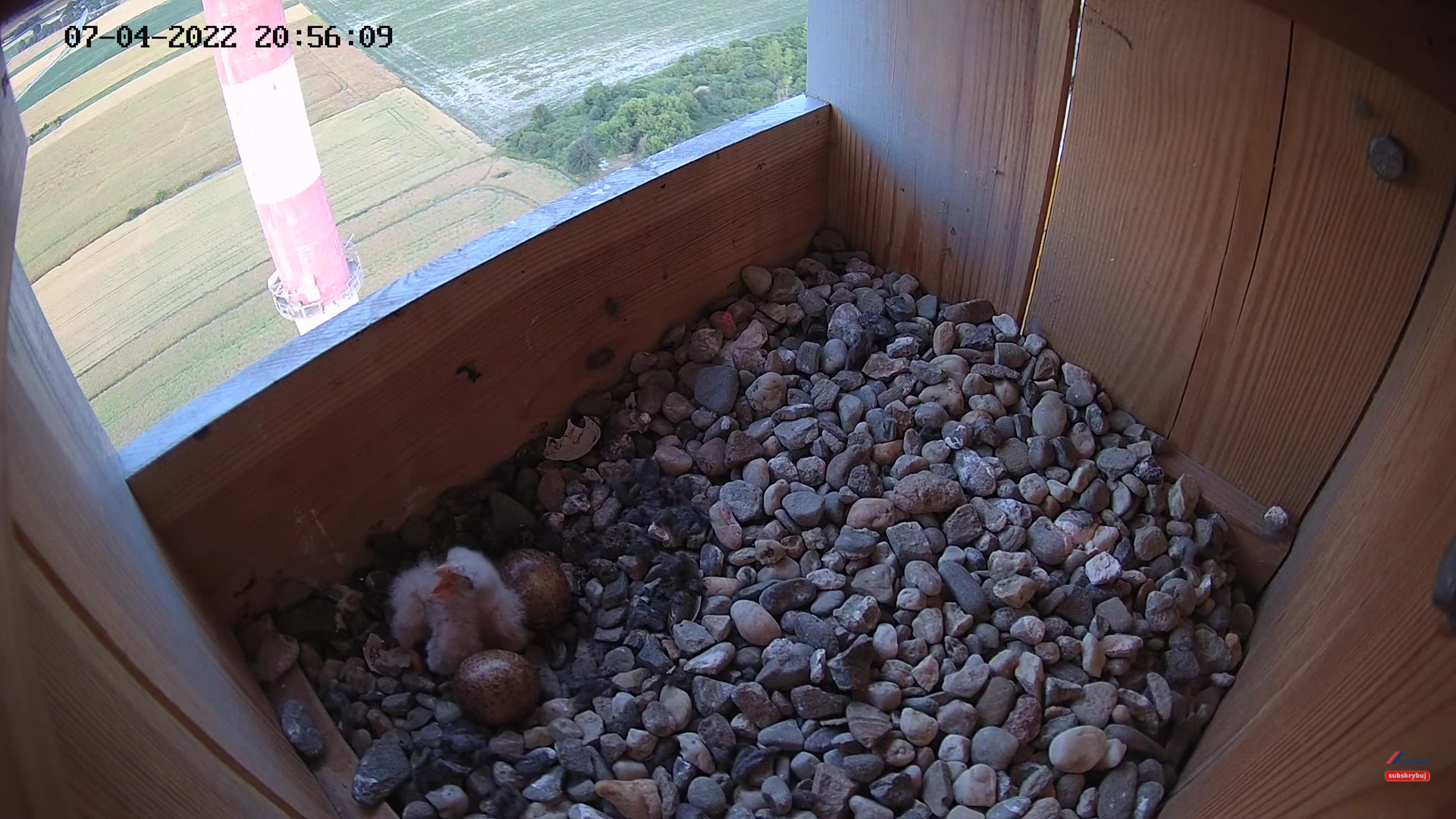 Czwarte pisklę u Rodziny Kruszywowskich w Cementowni Rudniki Czas między wykluciem pierwszego i ostatniego pisklęcia w lęgu wynosi około 2,5 doby (Rejt Ł., 2007, Biologia lęgowa pustułki Falco tinnunculus w środowisku miejskim Warszawy), zatem to prawdopodobnie ostatnia w tym roku pustułka, która pojawi się w tym gnieździe. |