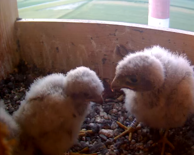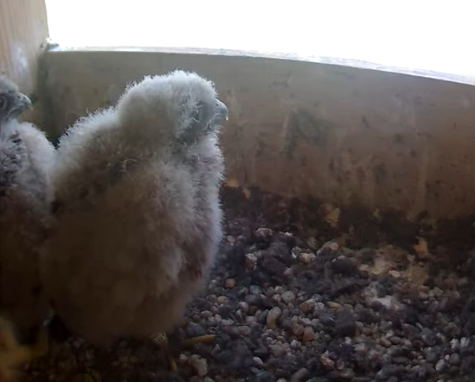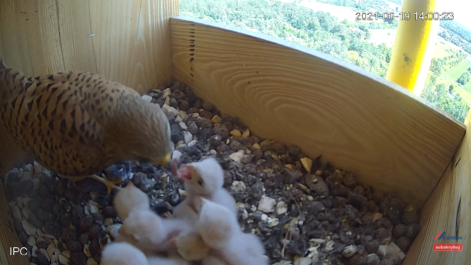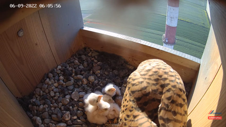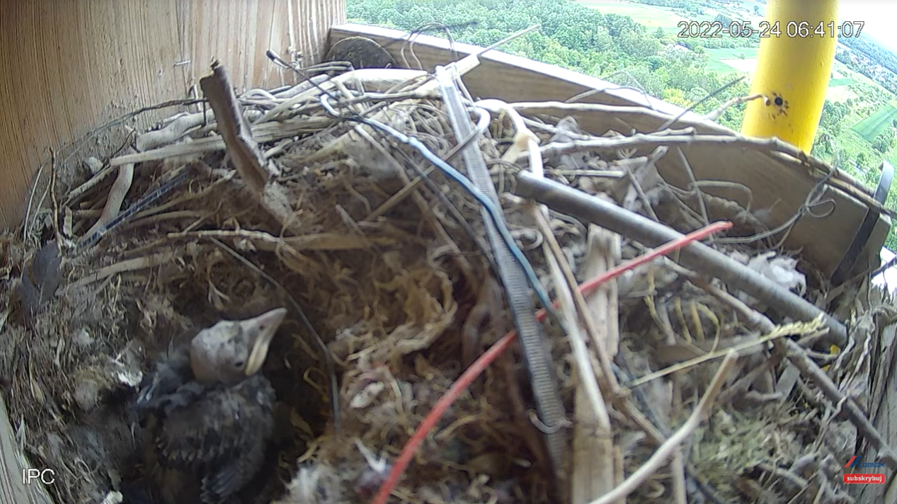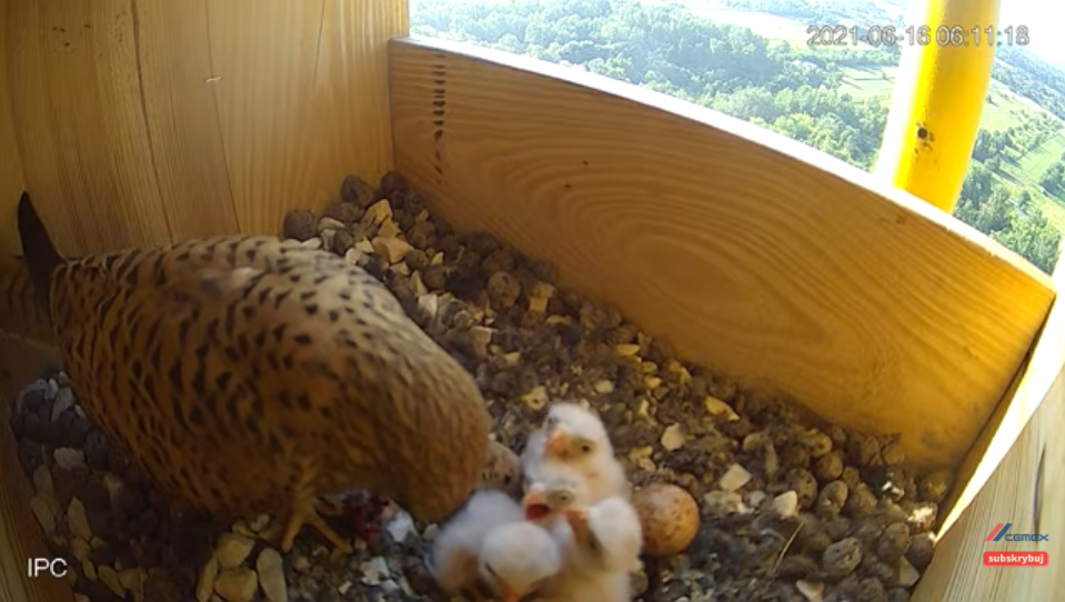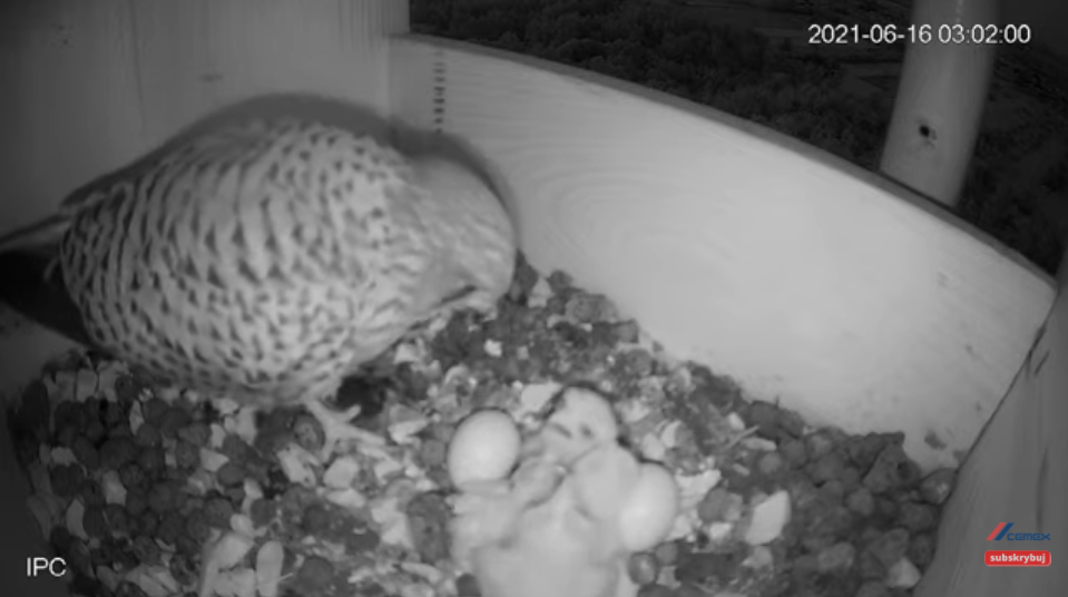 Czwarte pisklę u Rodziny Kruszywowskich w Cementowni Rudniki Czas między wykluciem pierwszego i ostatniego pisklęcia w lęgu wynosi około 2,5 doby (Rejt Ł., 2007, Biologia lęgowa pustułki Falco tinnunculus w środowisku miejskim Warszawy), zatem to prawdopodobnie ostatnia w tym roku pustułka, która pojawi się w tym gnieździe. |