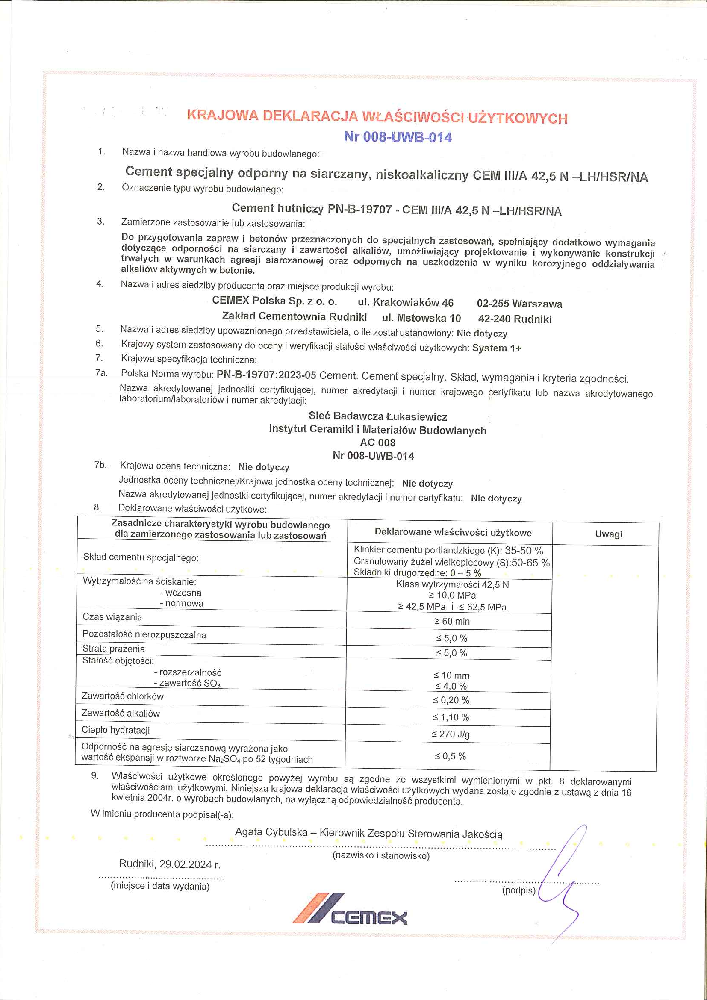 - Minimalizacja ryzyka reakcji alkalicznej dzięki zastosowanym dodatkom mineralnym i niskiej zawartości alkaliów (NA)