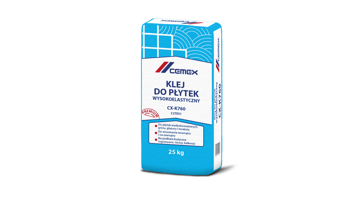 Klej do płytek wysokoelastyczny CX-K760 służy do przyklejania różnego rodzaju płytek gresowych, wielkoformatowych, płytek glazurowanych, terakotowych i kamiennych (poza marmurowymi) na podłożach krytycznych (odkształcalnych, podgrzewanych, na tarasach i balkonach itp.). W przypadku stosowania kleju do przyklejania okładzin kamiennych, należy każdorazowo wykonać próbę na przebarwienia. Do stosowania wewnątrz i na zewnątrz budynków.