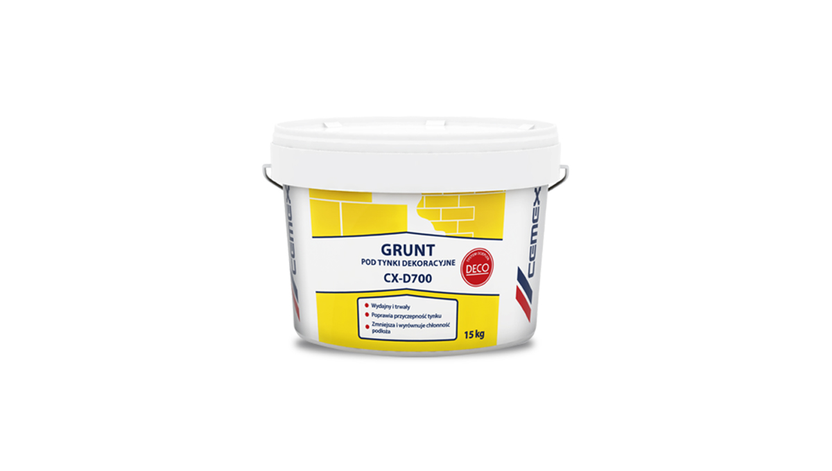 Grunt pod tynki dekoracyjne CX-D700 służy do wytwarzania szorstkiej, poprawiającej przyczepność warstwy podtynkowej na podłożach mineralnych oraz do zmniejszania i wyrównywania chłonności podłoży. Do stosowania pod tynki mineralne wewnątrz oraz na zewnątrz budynków (np. w systemach ociepleń). Grunt można stosować również pod tynki akrylowe. Można stosować na warstwę zbrojącą w systemach ociepleń budynków, tynki cementowe, cementowo-wapienne i wapienne oraz powierzchnie betonowe.