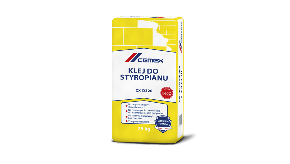 Klej CX-D320 służy do przyklejania płyt styropianowych na typowych podłożach mineralnych w systemach ociepleń budynków. Można stosować na mury z cegieł i pustaków ceramicznych, silikatowych, bloczków z betonu komórkowego i innych, powierzchnie betonowe, tynki cementowe, cementowo-wapienne i wapienne.