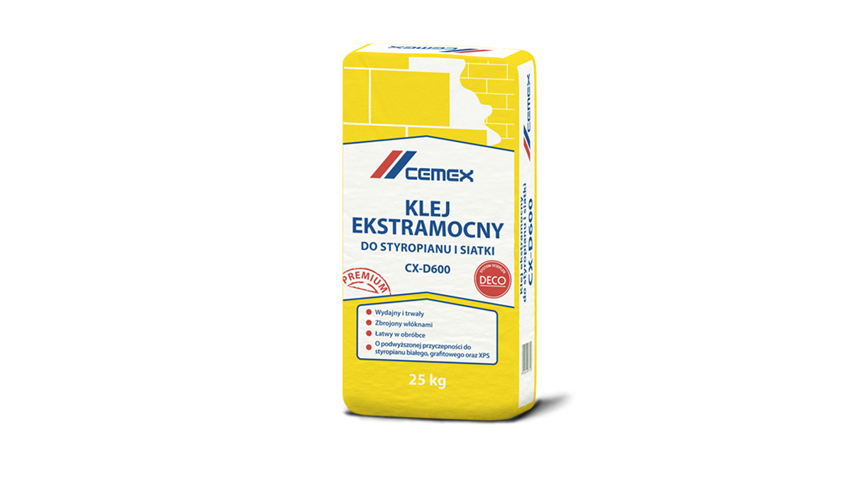 Klej CX-D600 służy do przyklejania płyt izolacji termicznej ze styropianu EPS (w tym płyt z dodatkiem grafitu) i polistyrenu ekstrudowanego XPS oraz do zatapiania siatki zbrojącej w systemach ociepleń. Można stosować na mury z cegieł i pustaków ceramicznych, silikatowych, bloczków z betonu komórkowego i innych, powierzchnie betonowe, tynki cementowe, cementowo-wapienne i wapienne, warstwę styropianu w istniejącym systemie ociepleń.