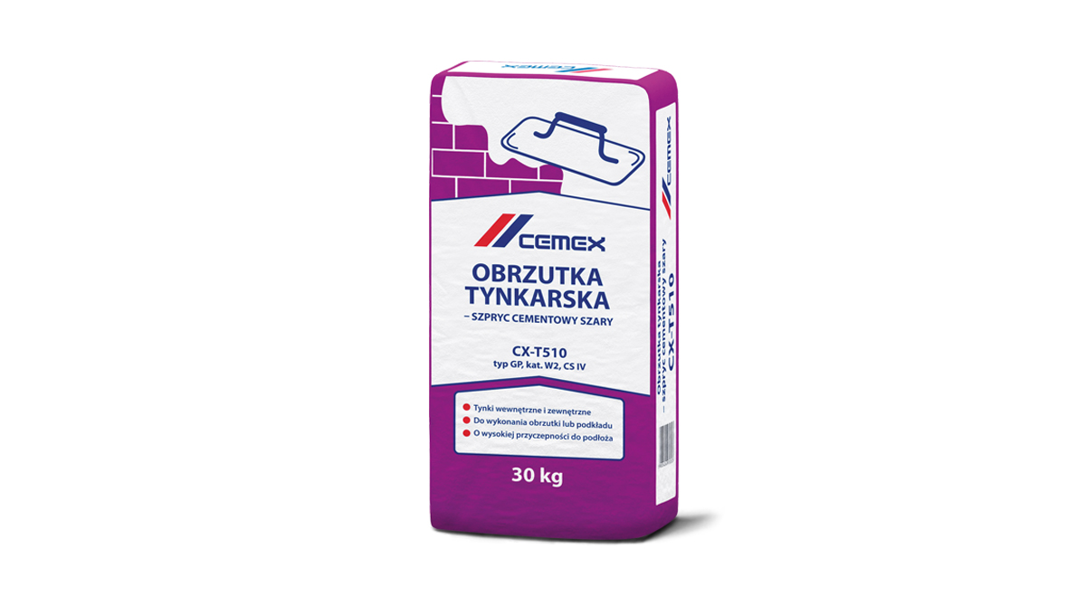 Obrzutka tynkarska stosowana jest do maszynowego wykonywania obrzutki wstępnej (szprycu) lub podkładu o wytrzymałości na ściskanie kategorii CS IV pod cementowe, cementowo-wapienne i wapienne wyprawy tynkarskie, wewnątrz i na zewnątrz budynków. Zalecany jako podkład pod tynki ręczne i maszynowe CEMEX. Tynk można narzucać również ręcznie. Uziarnienie do 1,6 mm.