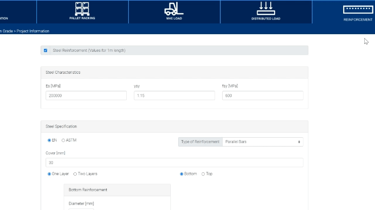 W obliczeniach należy uwzględnić wszelkie równomiernie lub liniowo rozłożone obciążenia na betonowej podłodze lub płycie. Narzędzie może pomóc w dostosowaniu projektu grubości podłogi, biorąc pod uwagę potrzeby zarządzania zapasami, niezależnie od tego, czy są to surowce, czy maszyny.