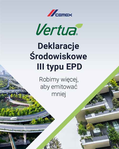 CEMEX Polska uzyskał certyfikaty EPD także dla niskoemisyjnych produktów betonowych – Vertua® classic oraz Vertua® plus. Betony Vertua® zostały wprowadzone na polski rynek w 2021 roku. Mogą być wykorzystywane na każdym etapie realizacji projektu budowlanego, a ich zastosowanie sprzyja redukcji emisji dwutlenku węgla w procesie budowlanym.