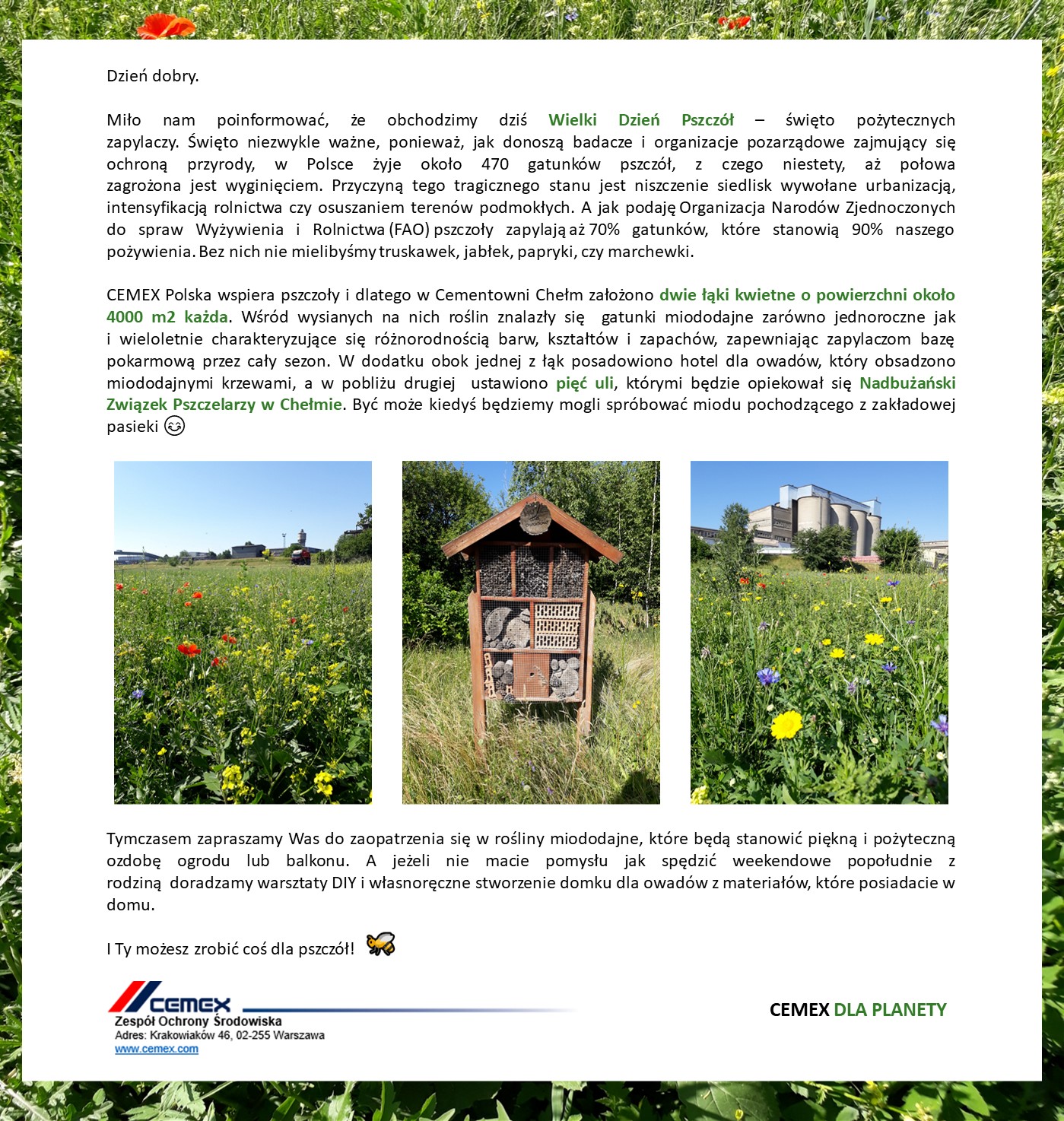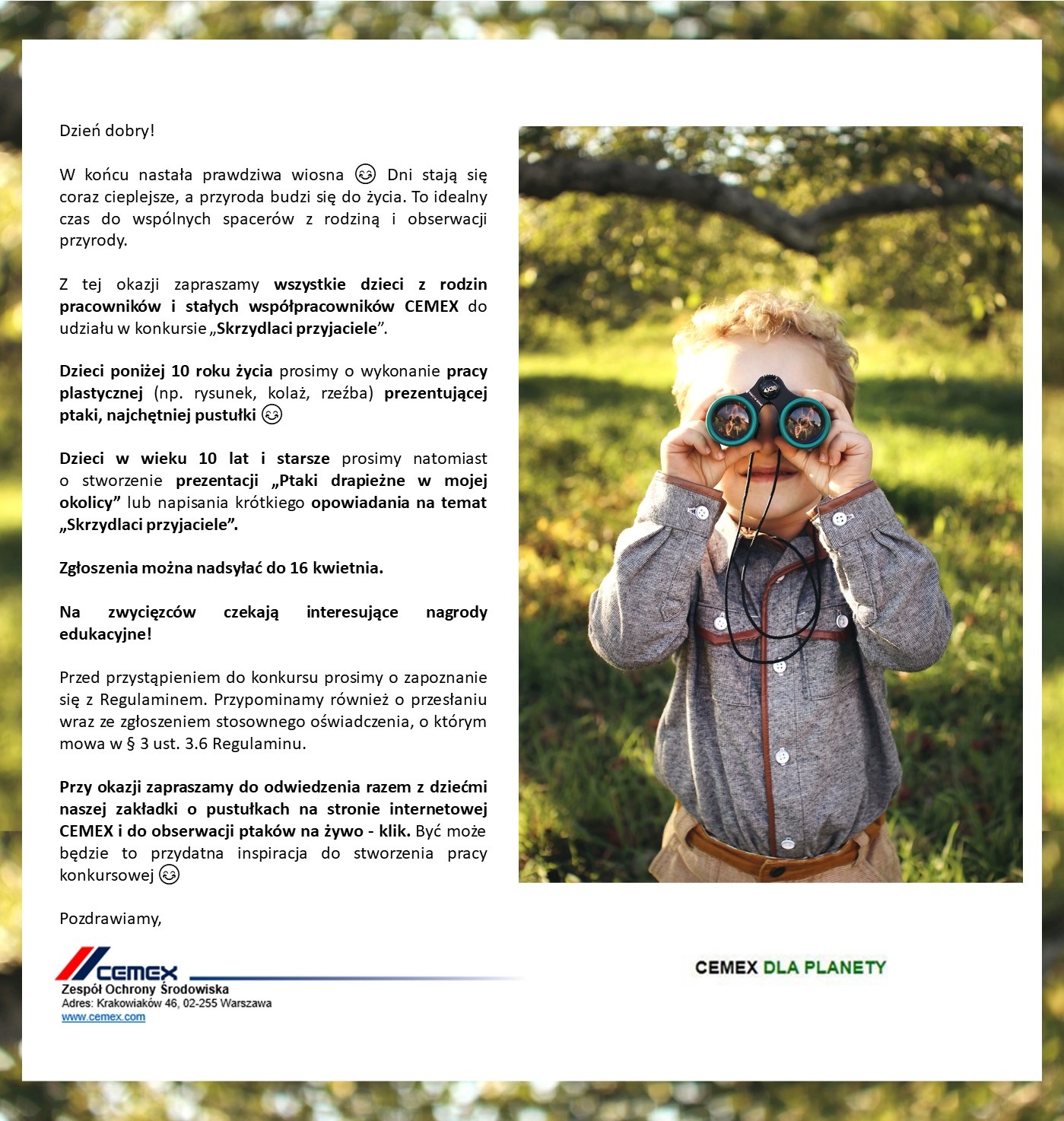 - Konkurs „I Ty możesz zostać eko-bohaterem” zorganizowany z okazji Dnia Ziemi, w ramach którego pracownicy CEMEX mogli sprawdzić posiadaną wiedzę z zakresu ekologii oraz pochwalić się tym, co na co dzień robią dla planety.