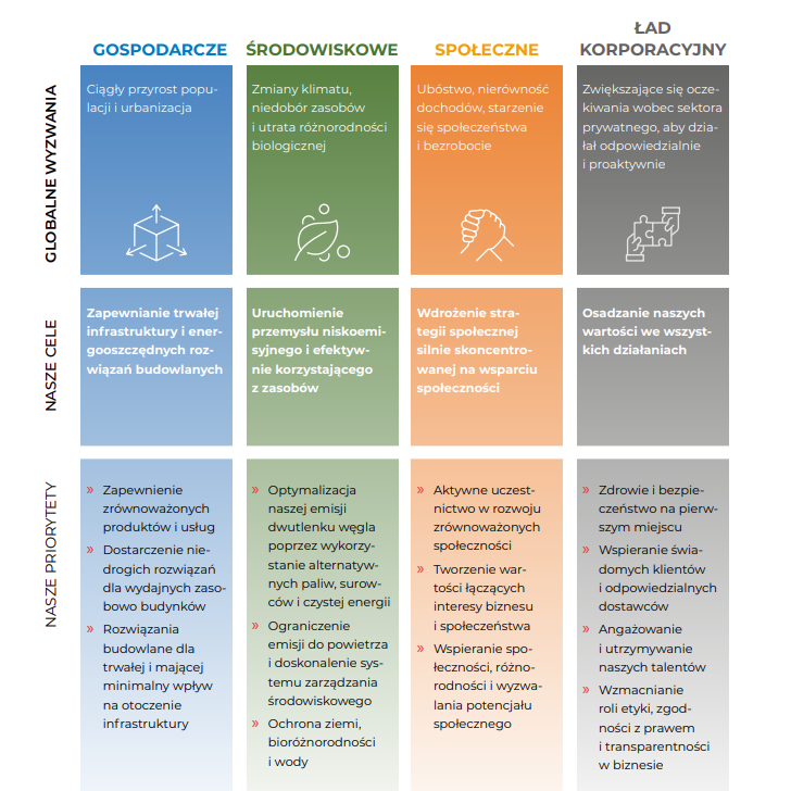 Model trwałego rozwoju, który wdrażamy w CEMEX, opiera się na czterech podstawowych filarach: gospodarczym, środowiskowym, społecznym i ładzie korporacyjnym, w ramach których zdefiniowano 13 kluczowych dla firmy obszarów działania. Dzięki temu zapewniamy, że zarówno nasza codzienna działalność, jak i procesy decyzyjne uwzględniają aspekty zrównoważonego rozwoju.
