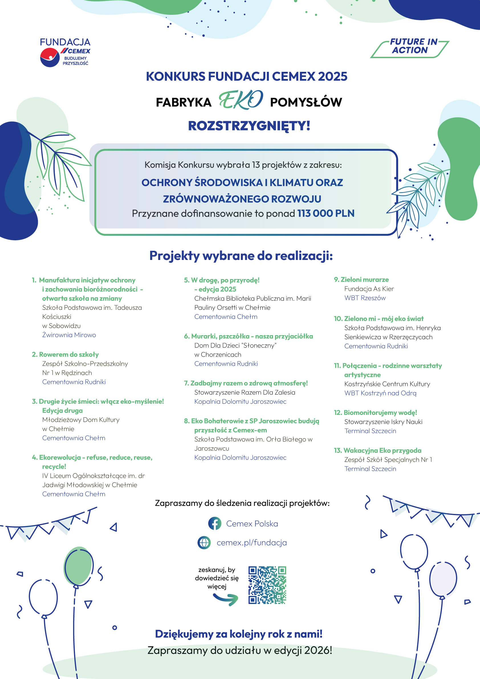 W ramach konkursu grantowego „Fabryka Pomysłów” Fundacja Cemex „Budujemy Przyszłość” wspiera projekty społeczne podejmowane przez lokalne organizacje pozarządowe i placówki edukacyjne.